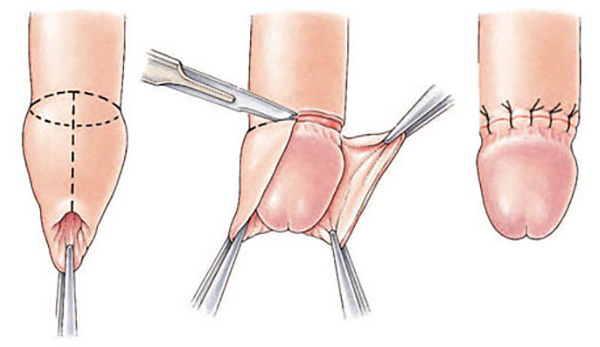 Η περιτομή έχει ως σκοπό την χειρουργική αφαίρεση του τμήματος της ακροποσθίας που καλύπτει τη βάλανο για να καταργηθεί η φίμωση. Η επέμβαση σε ενήλικες άνδρες γίνεται σχεδόν αποκλειστικά με τοπική αναισθησία και διαρκεί περίπου 40 λεπτά και δεν χρειάζεται νοσηλεία. Συνήθως τοποθετούνται απορροφήσιμα ράμματα κυκλοτερώς και περιδένεται το πέος για 3-5 ημέρες για την αποφυγή αιματώματος. Τα ράμματα διαλύονται αυτόματα σε ένα περίπου μήνα και τότε μπορεί να επανέλθει και ο ασθενής στην σεξουαλική του δραστηριότητα.